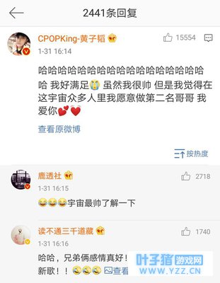 在鹿晗转发完微博不久,黄子韬在他微博下回复:我好满足,虽然我很帅,但是我觉得在这宇宙众多人里我愿意做第二名,最后还表白鹿晗:哥哥,我爱你!