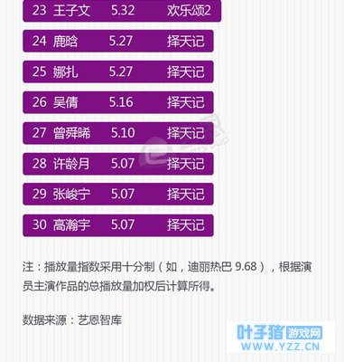 2017年度小荧屏中,迪丽热巴炙手可热,凭借《三生三世十里桃花》《漂亮的李慧珍》和《秦时丽人明月心》三部剧集登顶播放量榜单;李沁和赵又廷分列亚军和季军位置;位居第四位的张嘉译,绝对是2017年度电视剧大户,主演了《白鹿原》《猎场》《急诊科医生》《我的体育老师》《卧底归来》《生逢灿烂的日子》6部剧集;热度大剧《人民的名义》和《择天记》分别助力多位演员登上播放量TOP30榜单。