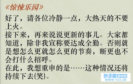 打游戏。三天两觉在写《惊悚乐园》的时候,酷爱打游戏。当然作者也是人不是神,休闲一下享受享受生活,也是可以理解的嘛!说不得大师倒是没有打游戏,人家开发游戏去了,而且还火了,看来以后更等不到填坑了。