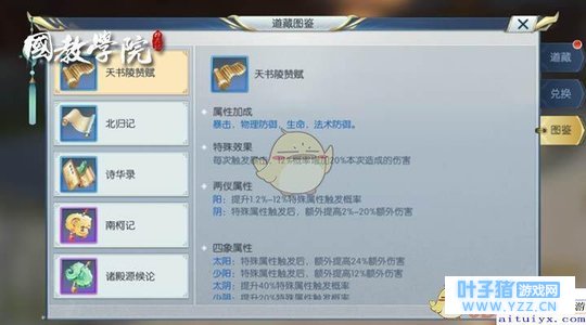 天书陵赞赋增加暴击、物理防御、生命、法术防御,触发暴击时有12%的概率增加20%的本次伤害。 北归记增加物理防御、全攻击、生命、法术防御,触发暴击后有8%的概率降低目标的治疗效果20%,可持续10秒, 诗华录增加物理防御、全攻击、生命、法术防御,被暴击时有8%的概率增加自身受到的治疗效果20%,可持续10秒。 南柯记增加物理防御、精准、全攻击、法术防御,命中目标时,5%概率降低目标8%的物理防御,可持续3秒。 诸殿源候论可提升物理防御、精准、全攻击、法术防御,命中时有5%的概率降低目标8%的法术防御,可持续3秒。 阵类本巢可提升韧性、物理防御、生命、法术防御,受到伤害时有8%的概率降低受到的伤害的20%。 洗髓论可提升闪避,物理防御、生命和法术防御,自身闪避时有8%的概率能够定身攻击者1秒。 朴门初解可提升物理防御、全攻击、生命和法术防御,目标闪避时有8%的概率增加自身10%的暴击率,可持续5秒。 京华迷烟录可提升物理防御、暴击减伤、生命、法术防御,在被暴击时有8%的概率给自己增加生命值得4%的护盾,可持续4秒。