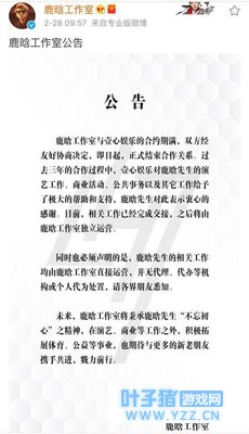 鹿晗归国三年里,经纪公司壹心娱乐作为其事业规划至关重要的幕后操盘团队,在这期间与他共同创造的成绩亮眼。2018年2月28日,鹿晗方面宣布与壹心娱乐的合约期满,正式结束合作关系,之后其工作事物将由鹿晗工作室独立运营。作为壹心娱乐的“顶梁柱”,鹿晗的离开对于壹心娱乐来说是个遗憾。