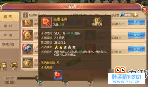 自由幻想v0.13.9 游戏类型: 角色扮演 游戏语言: 简体中文 仙侠 新游戏 up2018 大小: 1.02GB 更新: 2017-10-18 自由幻想手游中的夫妻结婚系统也是国产网游中的老设定了,在本作中夫妻通过共同完成相应任务可以习得专有的独特技能,那么这些任务具体如何完成呢?下面小编就为大家详细讲解一下。 那么完成“夫妻任务”有些什么样的奖励呢? “夫妻任务”最直接的,就是可以获取恩爱值用以升级夫妻技能,如“比翼双飞、生死相依”这两个技能,共十级,每升级一次,都会得到相应减少技能冷却、增加恢复气血、法力的比例,技能说明如下: