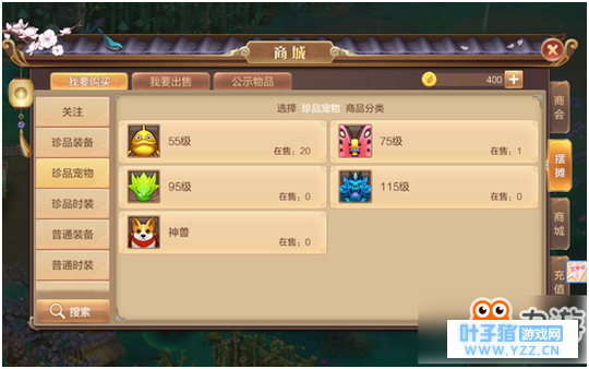 宠物类:宠物分为55级、75级、95级、115级和神兽五大类别,也就是说只有珍品宠物才能拿得上摆摊系统。