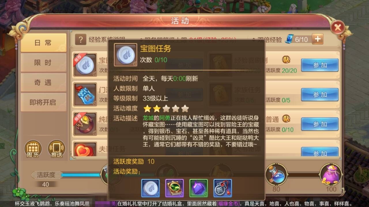 在《自由幻想》的手游世界里,有很多日常任务,都是每日必做的,藏宝图任务就是其中之一。下面,就让我带大家一起了解一下藏宝图任务,并一同去挖个宝吧。 宝图任务如何接取? 到龙城地图找到NPC阿勇,与之对话,即可接取任务。当然,如果你不知道阿勇在哪,可以在主界面上方的活动选项里找到宝图任务,然后开始自动寻路找到他哦。 任务每天只能做十次,接取任务后无需,十次会连续自动完成哦。 宝图任务如何做? 接取任务后,我们需要去击败盗宝凶徒,等级与玩家本身是相同的。盗宝凶徒的击杀还是较为简单的,我们直接自动战斗即可,打败他即可获得宝图,完成10次后还可领取大量经验哦。 如何挖宝图?都能挖到什么呢? 获取了宝图,我们可以在包裹中找到藏宝图,直接点击宝图上面会显示藏宝的位置。不用管这么多,我们直接使用,然后自动传送寻路前往挖宝点即可。藏宝图的使用并不限制你次数,你可以多存几天再一次挖。不过,真的很占包裹的格子,还是早用早省事吧。 藏宝图可以挖到银钱袋、技能书、宠物元神、万年玄石等等大量物品。当然也可能挖到怪物,打败它,同样可以获得奖励。反正只有你想不到,没有你挖不到滴。 总结 挖宝图是一个不错的致富途径,所以每天的宝图任务最好是都完成。一天不做感觉就比别人少了几个亿一样,难受的要命啊。 |