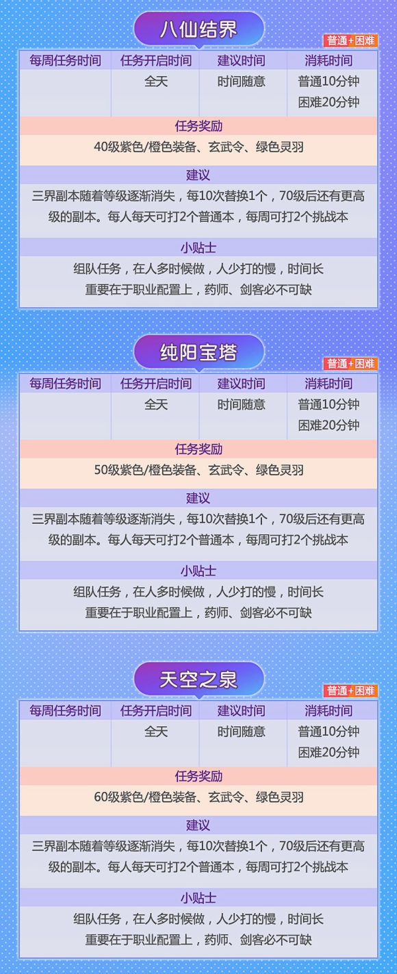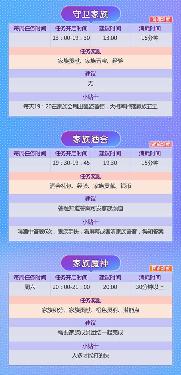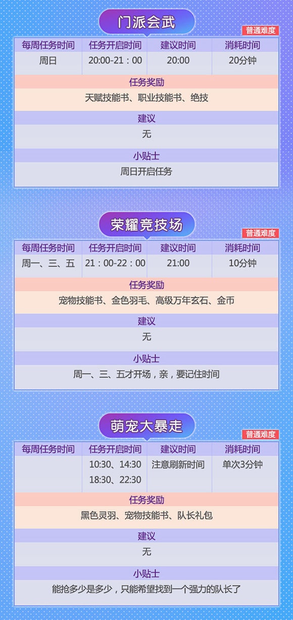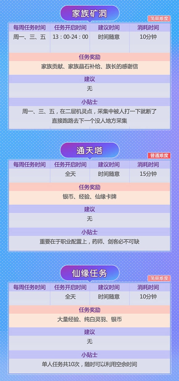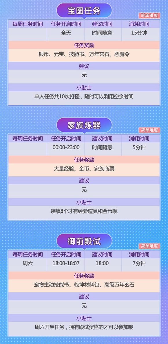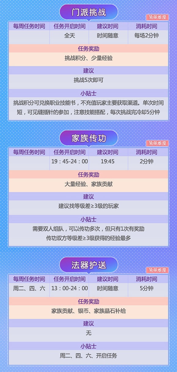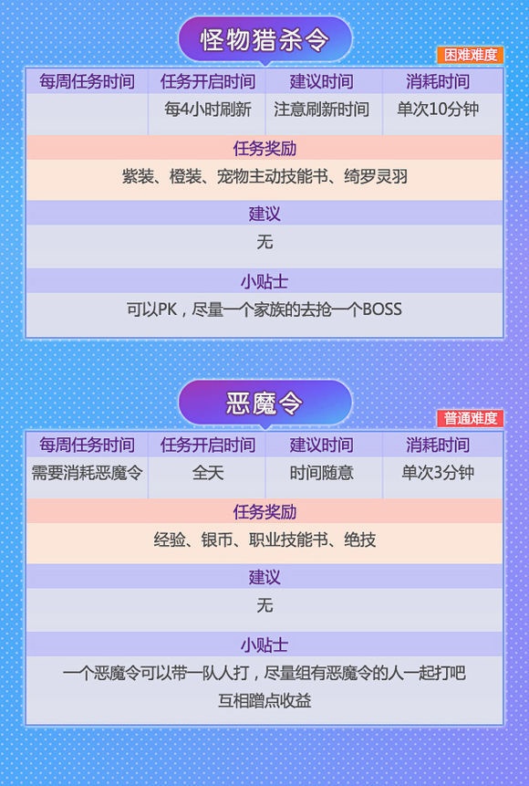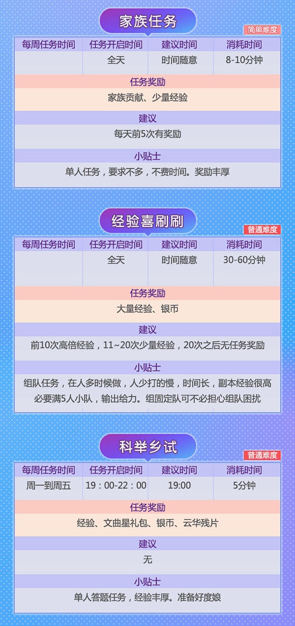 对于刚进游戏的小白们来说,做任务是一件很头疼的事。除了必须要做的主线任务外,还有每天的日常试炼,副本战场等活动。如果没有师父带,还真是一筹莫展。到底什么样的任务做起来轻松又能赚得盆满钵满?别着急,小编这就来和你叙一叙! 在幻想里,除了主线任务还有活动任务与特殊任务。有些任务可以单人完成,有些则需要组队。因此结拜做任务可以说是一个小捷径,不仅能获得更多经验奖励,还能根据结拜兄弟的活跃度领取礼包,亲密度提高还有羽毛可以领! 小编粗略算了下,幻想手游中每天有将近三十多种任务,玩法多样,丰富你的江湖生活!绝对是工作学习闲暇之余的放松利器、快乐源泉! 那这么多任务到底该怎么做,又能获得哪些奖励呢? 请!看!下!图! 千万别被看似超多的任务吓到!和小伙伴们组成固定队,经验奖励手到擒来!组队结拜一条龙服务你值得拥有! 快叫上你的亲朋好友,一起赴十年之约吧! |