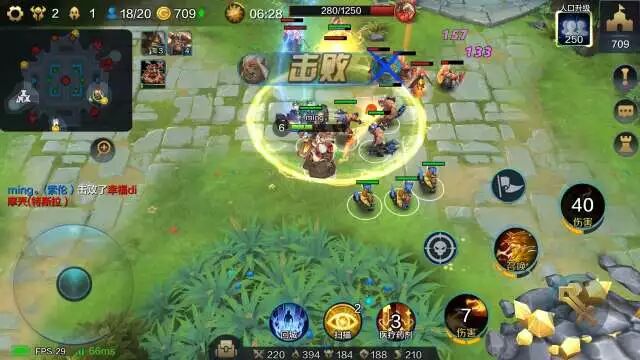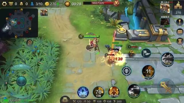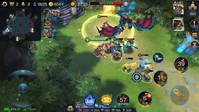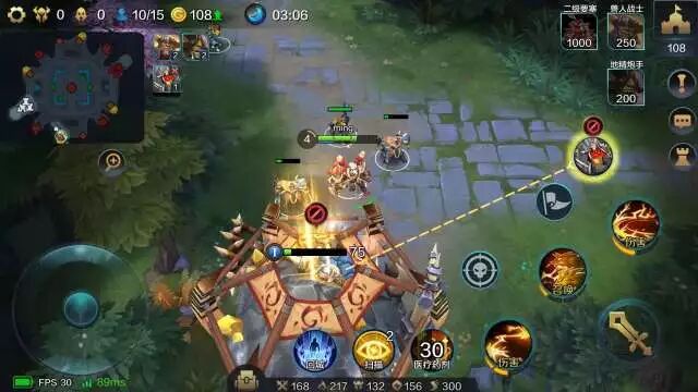 明明建议大家可以先回城补满气血和魔法,然后直奔地图下方离你最近的金矿,击败野怪来开第一个矿。明明是没有回家直接赶过来开矿的,所以小兵已经所剩无几。