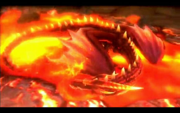 这个就可以算是特异个体了,这头红黑龙和其它排斥熔浆的同类不同,它相当喜欢熔浆,经常呆在里面泡澡,体表是亮眼的明红(黄)色,愤怒时颜色更亮,就像烧起来了似的。招式也有了增加,强有力的热波、滑翔突击、地雷等新招式。