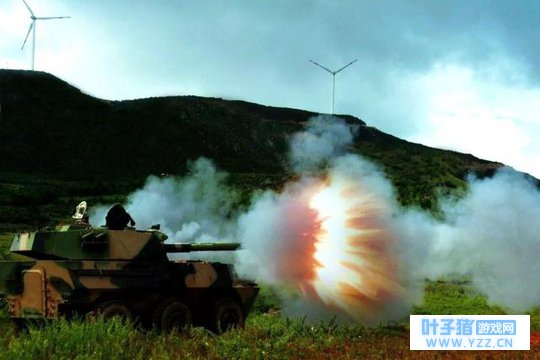 图:自行火炮在山地进行实弹射击,注意画面左侧,出膛的炮弹被定格。