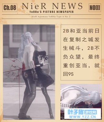 2B很着急 并且到处寻找9S 最后根据微弱的信号 在亚当的复制之城找到了9S 亚当解开了和机械网络的连接 并且和2B厮杀了起来 不能无限复活的亚当最后被杀死了 9S因此得救