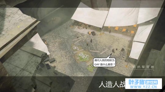 了解完机械村庄的信息之后 抵抗军营地附近发现了巨型恩格斯入侵 于是2B和9S火速支援 并且在击败恩格斯之后 发现地底出现了巨洞