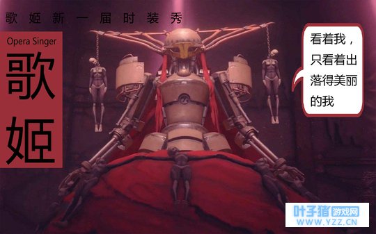 出洞穴之后的2B和9S接到新的任务 追寻之前人造人遗留下来的黑盒子信息 于是见到了喜欢穿戴人造人的歌姬 妈呀~ 歌姬还想着这样会变得漂亮 她这样已经审美扭曲了!