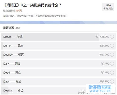 看看这些人,他们中哪一个人不是在影响着整个海贼王的世界。虽然D之一族人数很少,但是个个都是影响力巨大的人物。那么D之一族究竟是为何而存在呢?许许多多的海米开始对这个神秘的一族进行着各种各样的讨论。最终D之意志出现了,作为D之一族最为核心的一点,他们的意志仿佛无形之中引导着整个世界,也就是说D之一族每个人都背负着各自的命运坚守着各自的D之意志。 在OPiece海贼王微博发起的【《海贼王》D之一族到底代表着什么?】投票活动中,广大海米纷纷表达了各自的想法: 目前约有1426名海米参与了此次投票,而关于D之意志的选项共有7个,分别是: Dream——梦想 Demon——恶魔 Destroy——毁灭 Dark——黑暗 Dead——死亡 Dawn——破晓 Destiny——命运 其中[梦想]被1215名海米认为是D之一族的代表,剩下的那些支持者只有十几人。